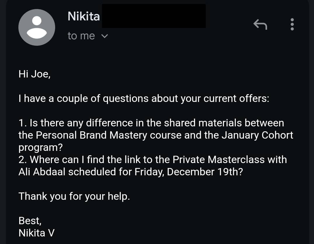 Hey friend, I had a great email from a reader called Nikita: “What’s the actual difference between the Personal Brand Mastery course and the January Cohort?” Perfect timing - because with Cyber Monday ending TONIGHT - you might be deciding between the two as well. So here’s the simple breakdown: Personal Brand Mastery (Course) Self-paced All the core frameworks and systems I use with clients Perfect if: you want the playbook to execute on your own. This is your roadmap but it's on you to get...