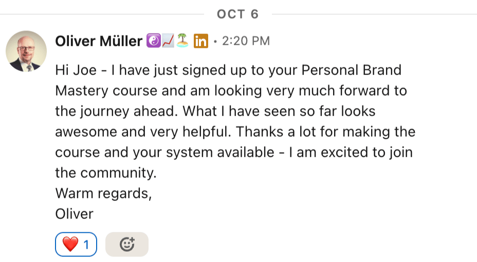 Just in case you missed it! 📹 Personal Brand Mastery - 50% off Transform your expertise into a personal brand people can’t ignore ($397 → $197) Implement the proven system we’ve used with the world’s top creators - grow your audience, attract opportunities, and build a brand you’re proud of 🚀 Join Personal Brand Mastery at its lowest price What PBM students think 👇 1/7 Chris (Solopreneur) - "Personal Brand Mastery takes you from being lost to found. It gives you a path and probably saved me...