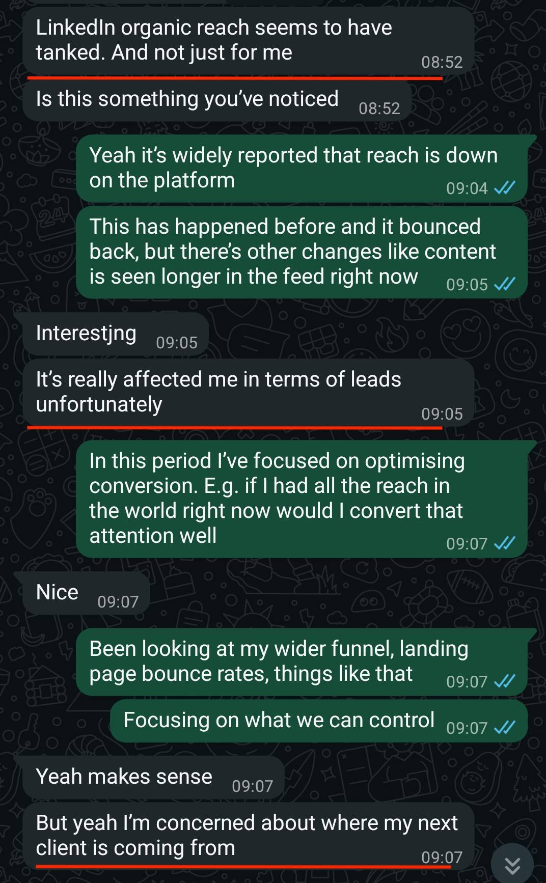 Yesterday, I received a WhatsApp from a founder friend who has a high-ticket consulting offer. He's concerned about where his next client is coming from: He's not the only one - I'm receiving DMs every day saying the same thing. Earlier today, I sent you a full lesson from Personal Brand Mastery for free. If you missed it, watch the video here. That 21-minute video helps you master attention on LinkedIn. On the other side of the coin from attention, we have conversion. Receiving more attention on a high-converting offer is like pouring fuel onto a fire. Even if you're in a niche or don't want to go mega viral, it's still true that you want both attention and conversion at play. Well, life has seasons and so does social media. If reach is feeling harder to come by right now (check out my video to solve that) what's that revealed in your business?